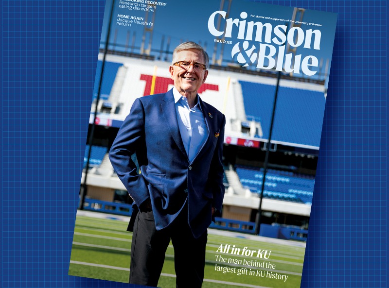 Welcome to the new Crimson & Blue magazine — a publication of KU Endowment, KU Alumni and the University of Kansas. The biannual publication curates news and stories for alumni and supporters of the University of Kansas and KU Medical Center, highlighting the people, places, events and traditions that make KU the state’s flagship nest.